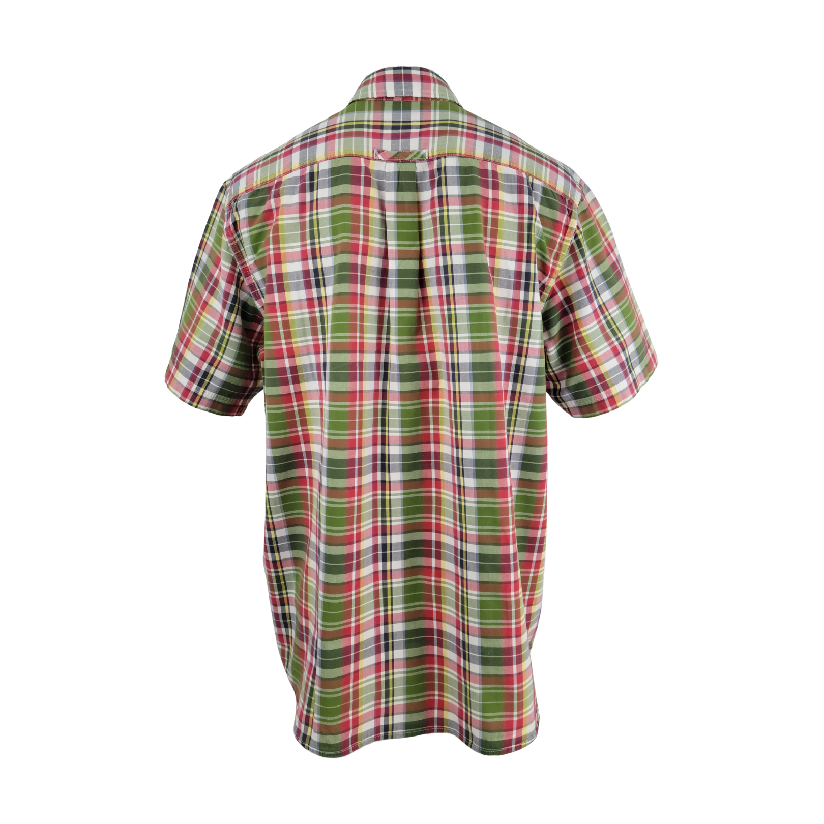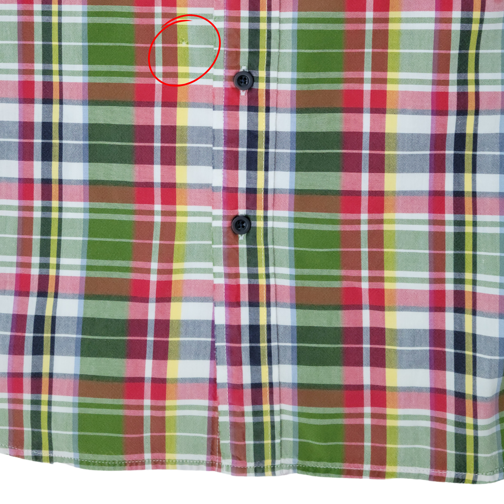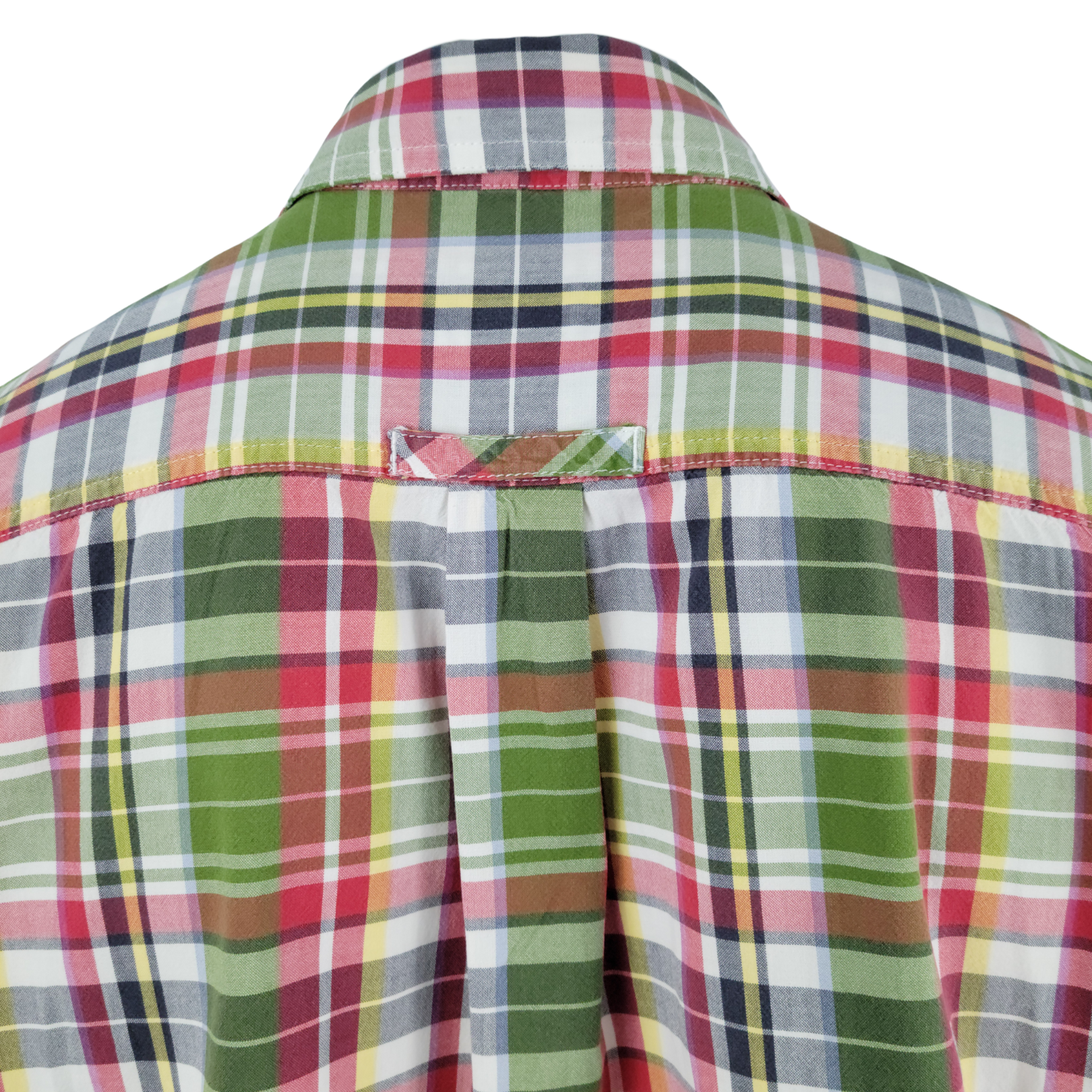 • Madras-style plaid in shades of green, red, yellow, white, and navy