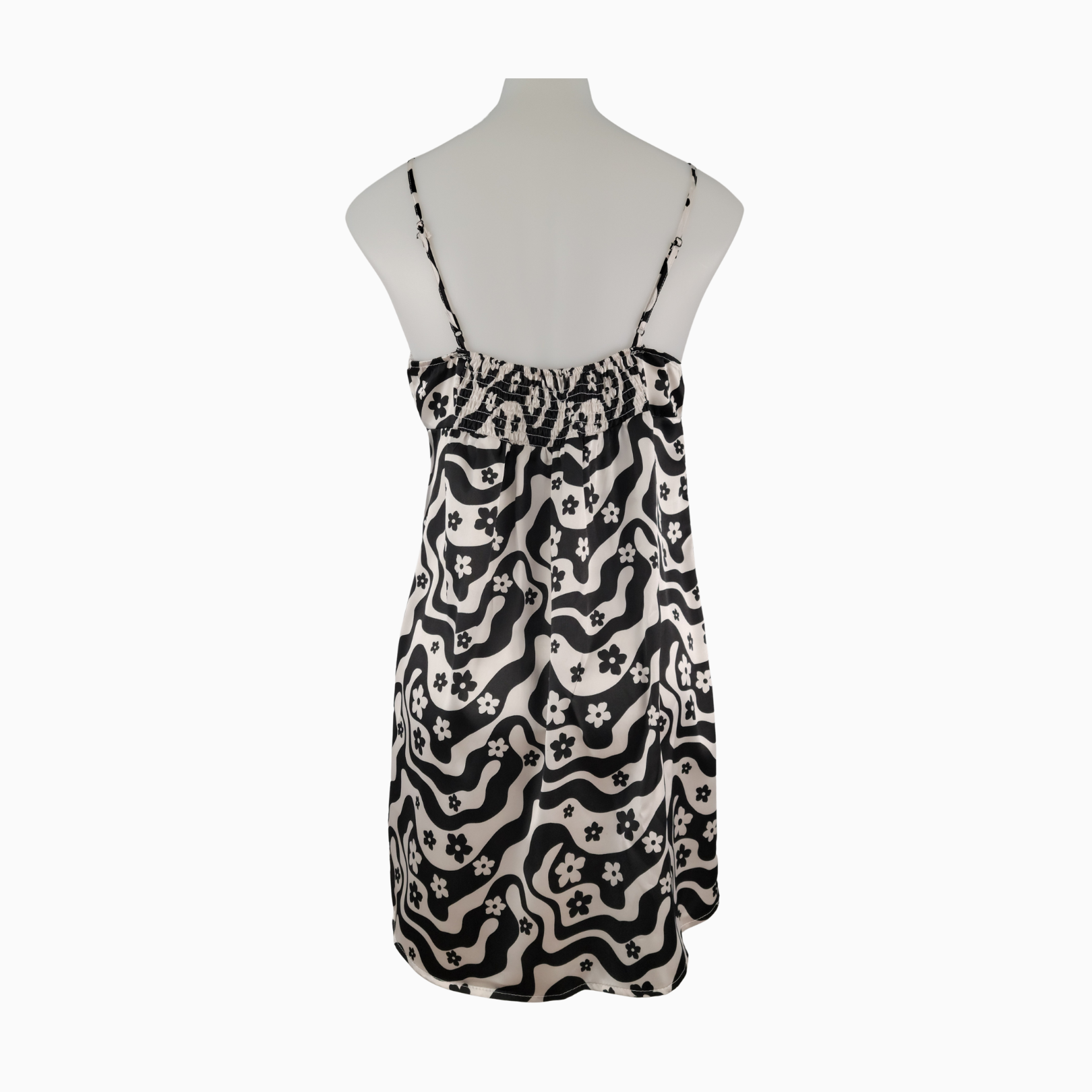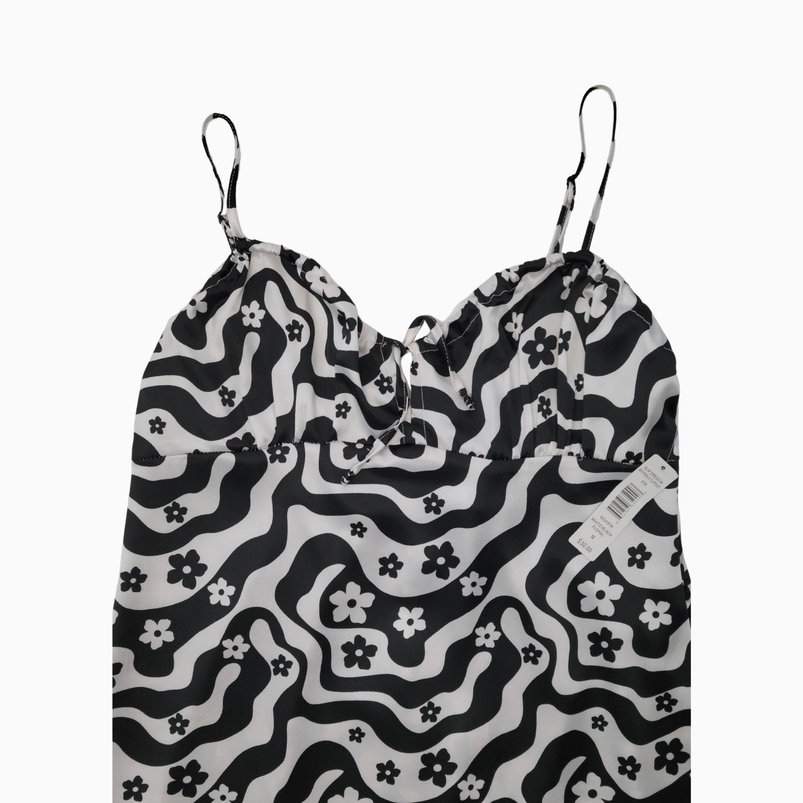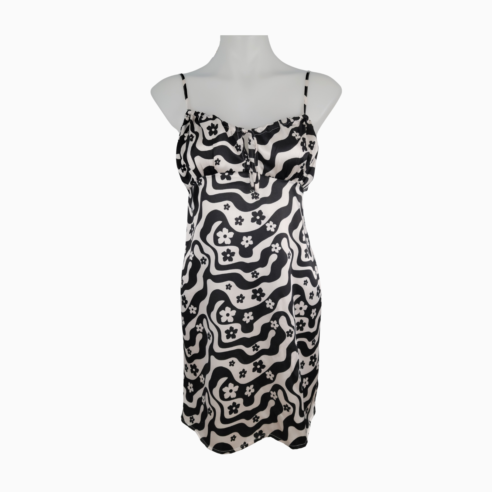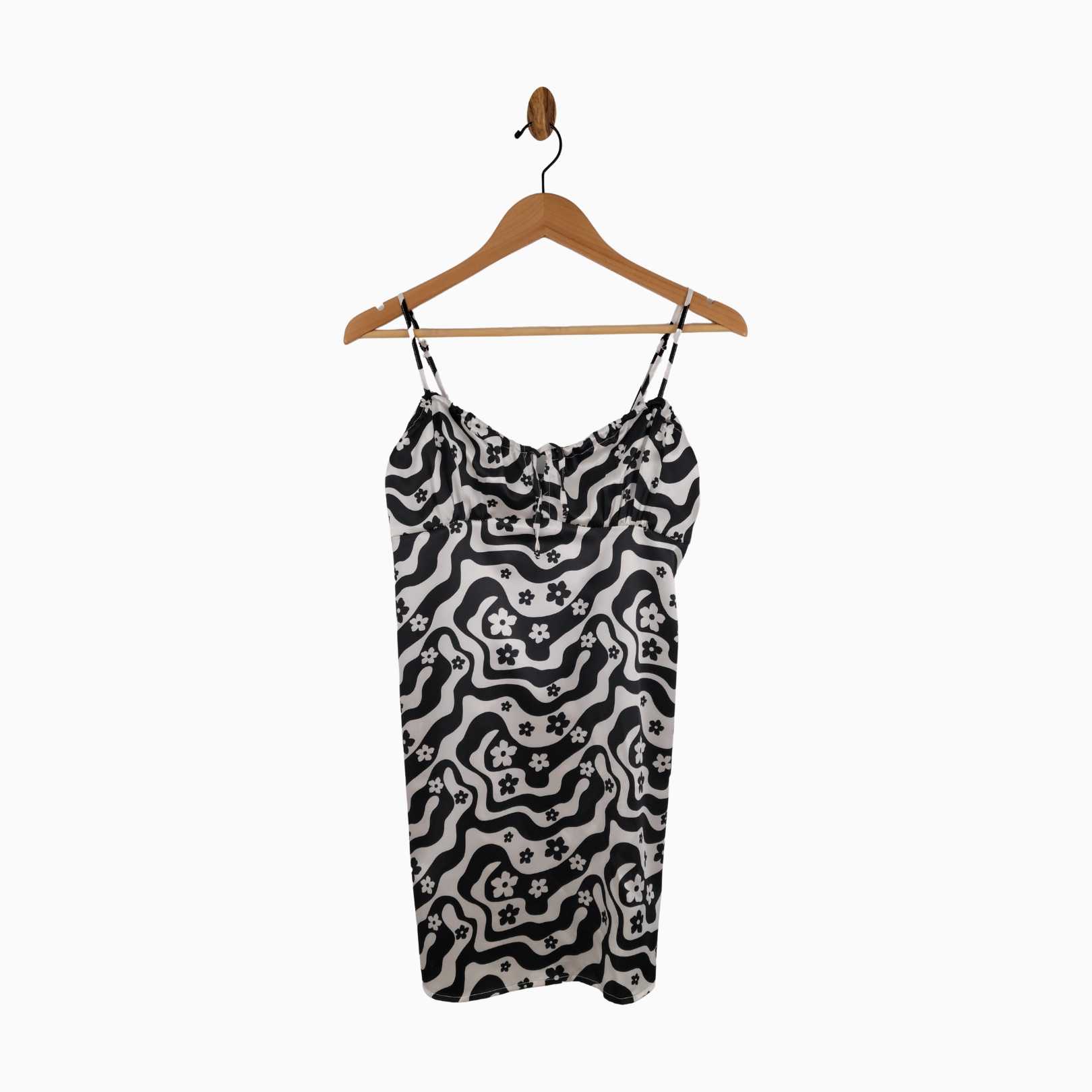 • Black-and-white abstract wave print accented with scattered floral motifs