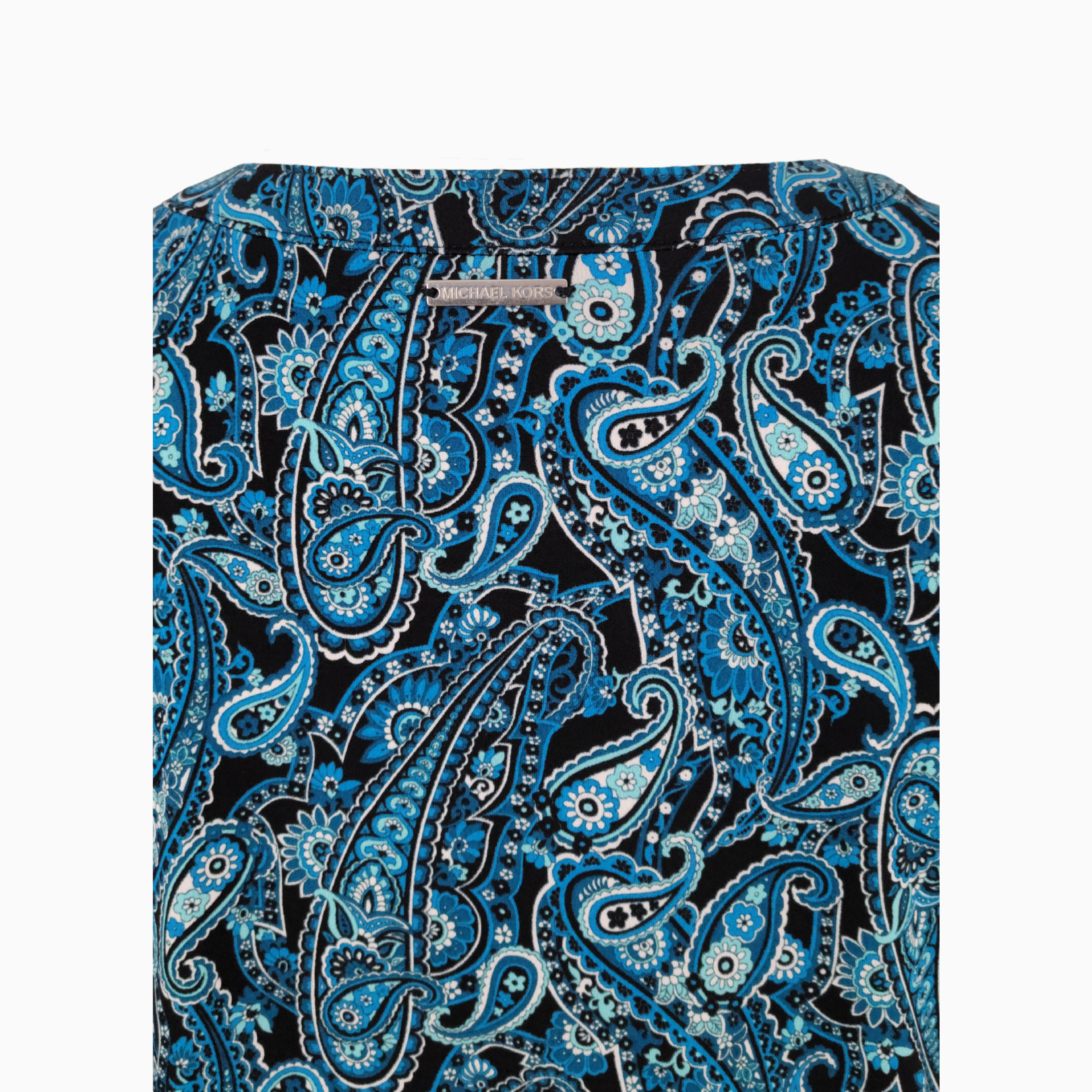 • Features an allover paisley print in shades of cyan blue, teal, and black