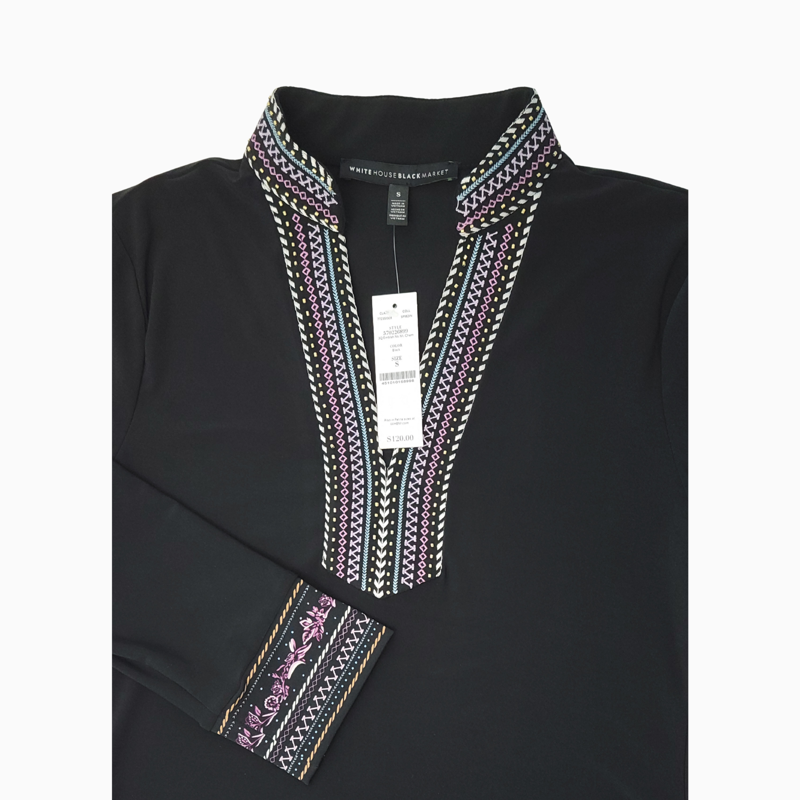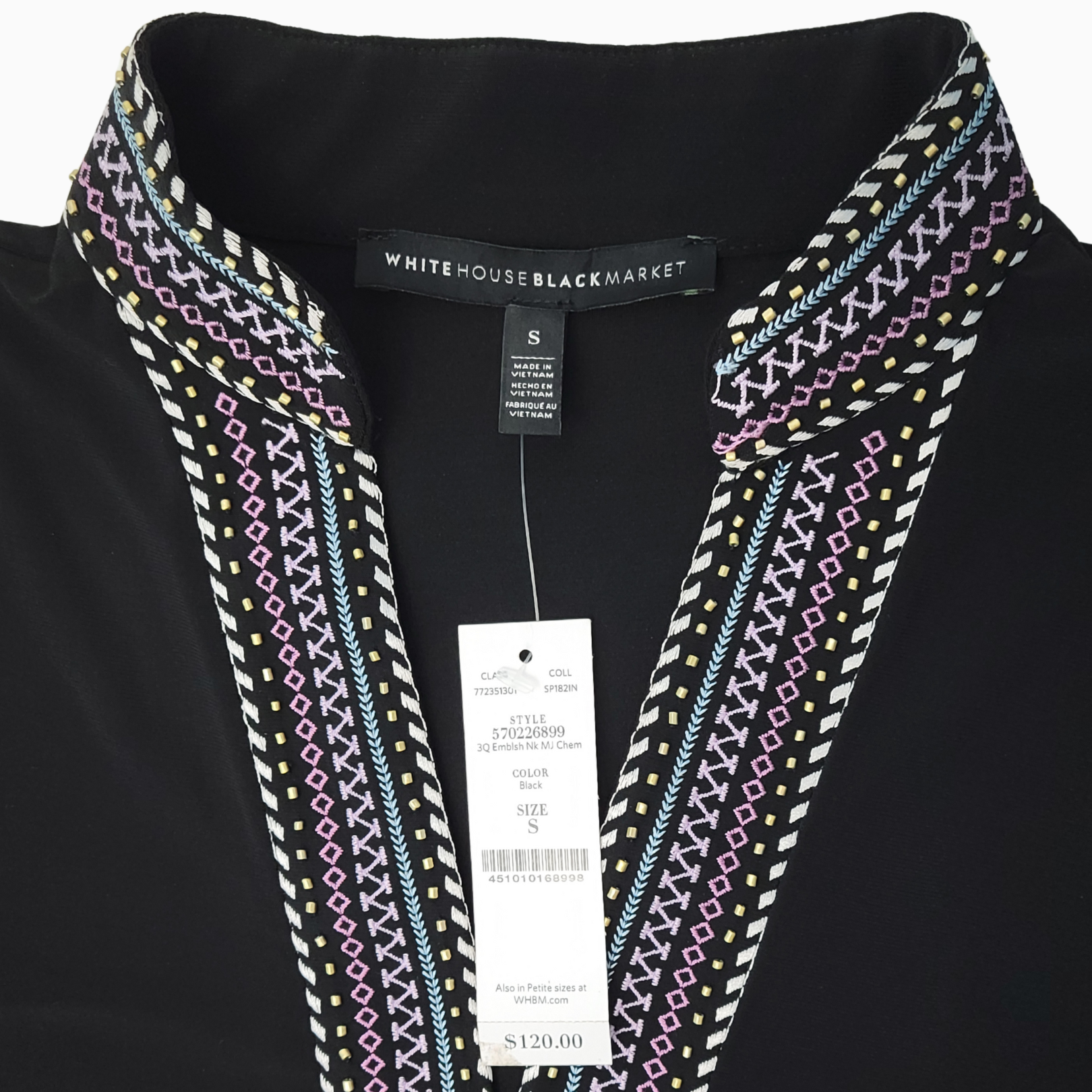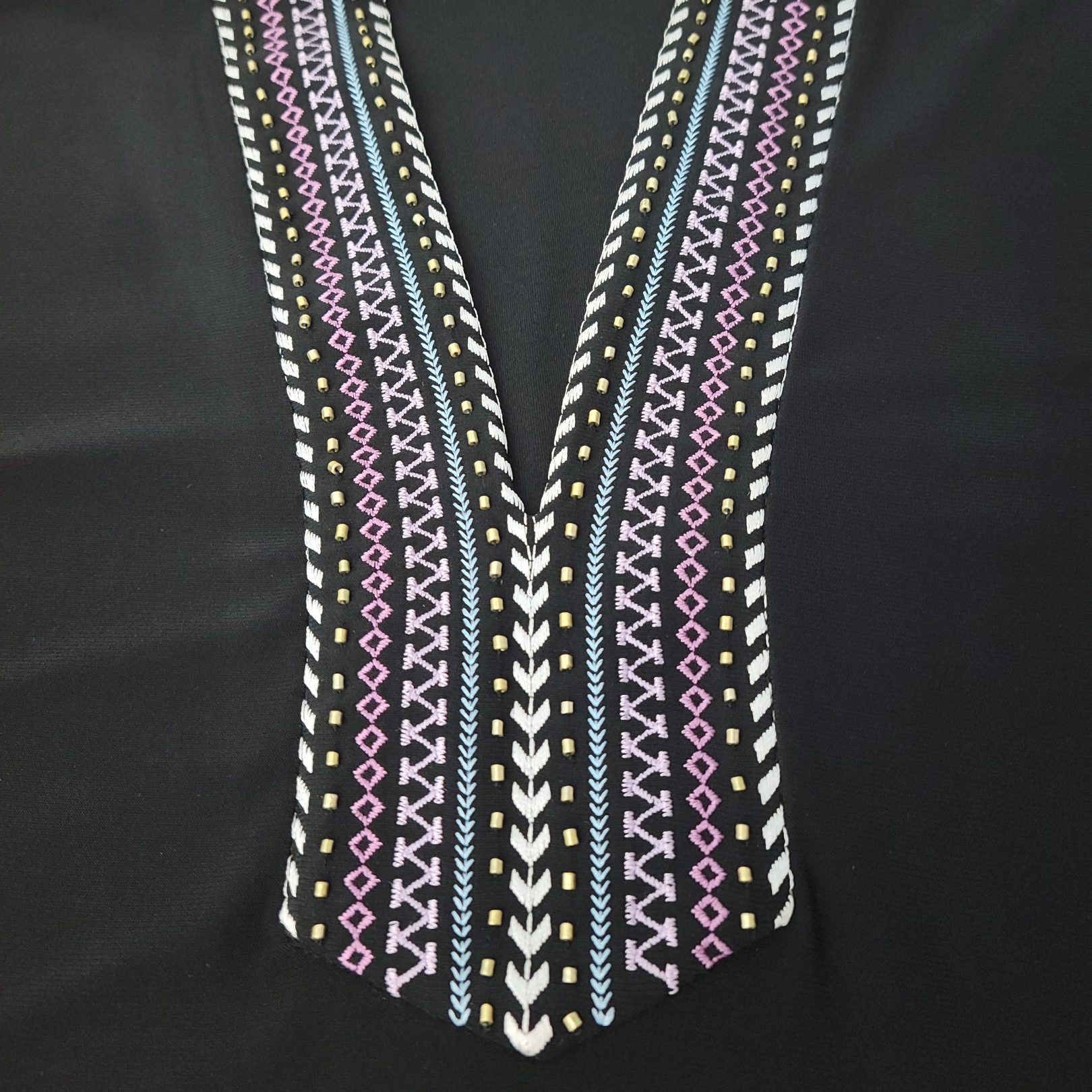 • Split V-neck with embroidered trim and gold-tone tube bead accents