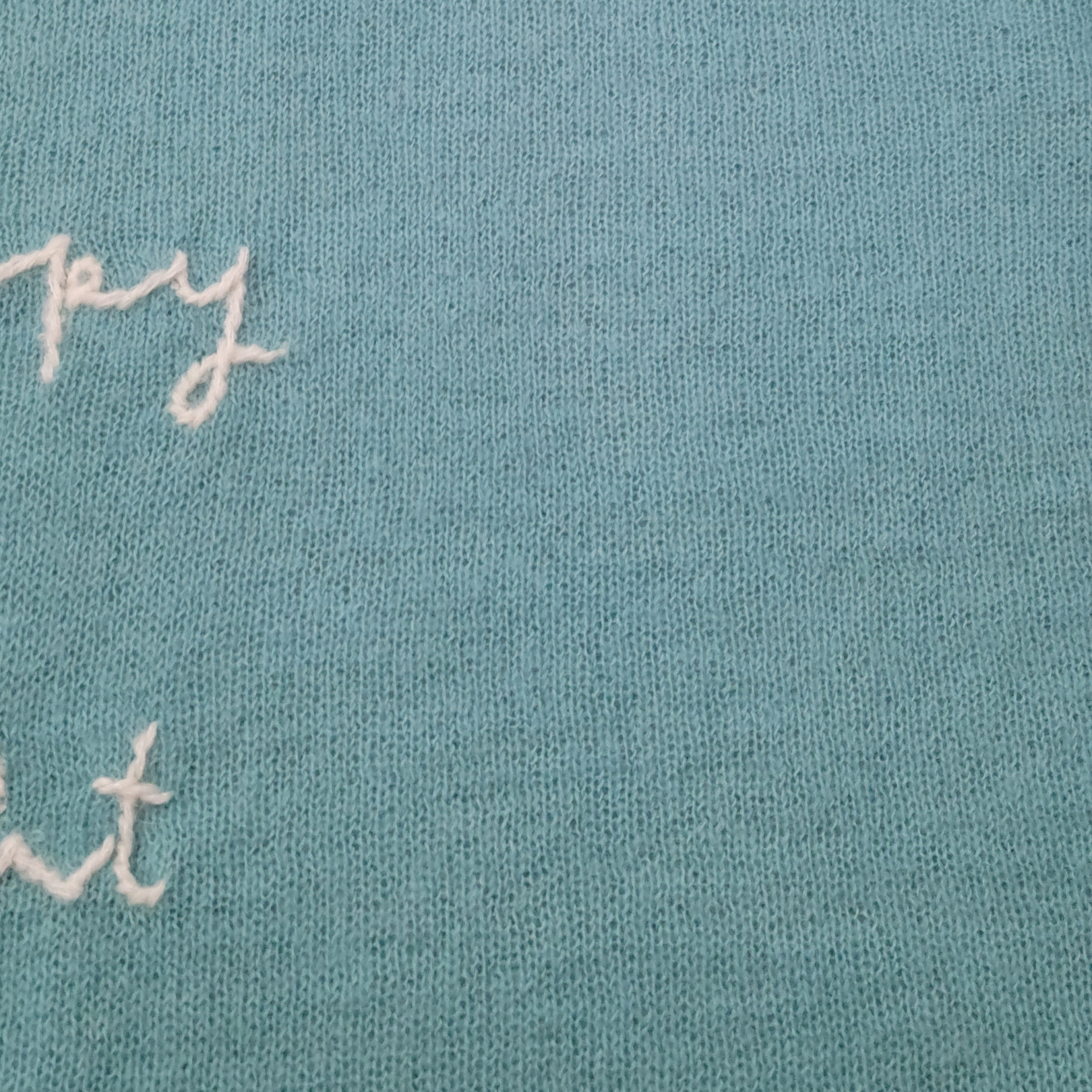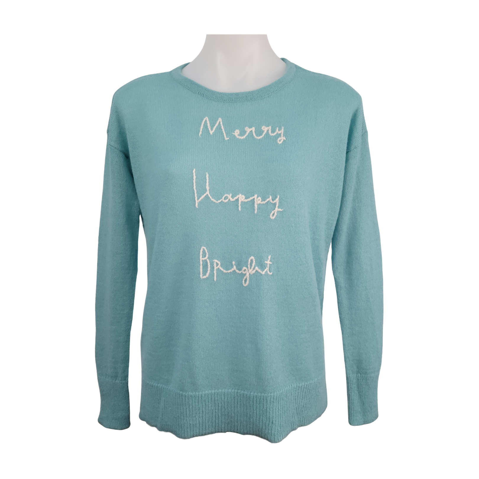 • White embroidered script: Merry, Happy, Bright